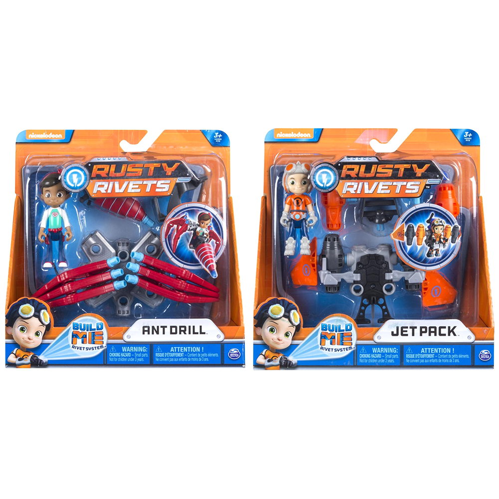 Nella confezione si trova tutto il necessario per ricreare il Jet Pack di Rusty oppure lo speciale Trapano di Ruby. Ogni confezione contiene 1 personaggino e 9 componenti da unire per poter costruire l'accessorio di Rusty e Ruby. I personaggi hanno collo, braccia e gambe articolate. Dotati del Build Me Rivet System™, un sistema brevettato che permette la facilità di assemblaggio e la durabilità del gioco di tutti i prodotti Rusty Rivets grazie ai ganci che garantiscono una connessione salda e articolata a tutti i componenti.
