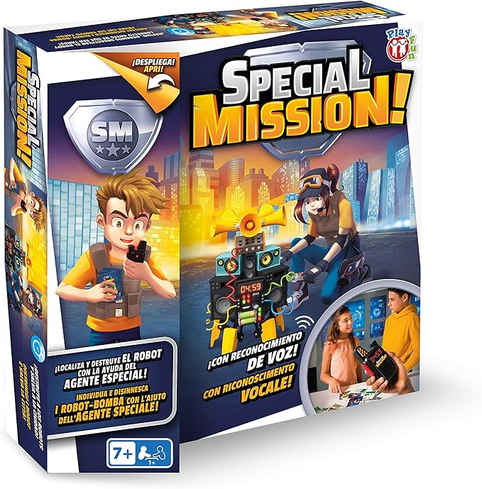 Special mission è il gioco per i bambini più intelligenti, dato che dovranno usare la testa per combattere la minaccia. I robot minacciano la città e sei il prescelto per salvarla aiutati con il riconoscimento vocale dei walkie talkie per trovare il robot indicato. Ascolta gli indizi dell'agente speciale e rispondi alle domande con intelligenza. Una volta localizzato il robot corretto, dovrai risolvere le missioni che indica la lettera e trovare i cavi da tagliare. Età consigliata a partire da 7 anni, funziona con pile (3 AAA da 1,5 v).