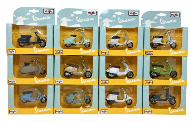 Colleziona i modellini die-cast in scala 1:18 prodotti da Maisto, dedicati alla leggendaria Vespa. Queste repliche sono curate nei minimi dettagli, e rappresentano il regalo ideale per appassionati di motori e collezionisti di miniature.